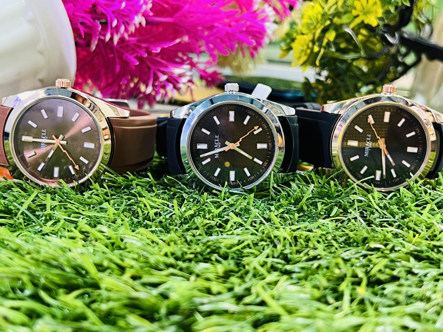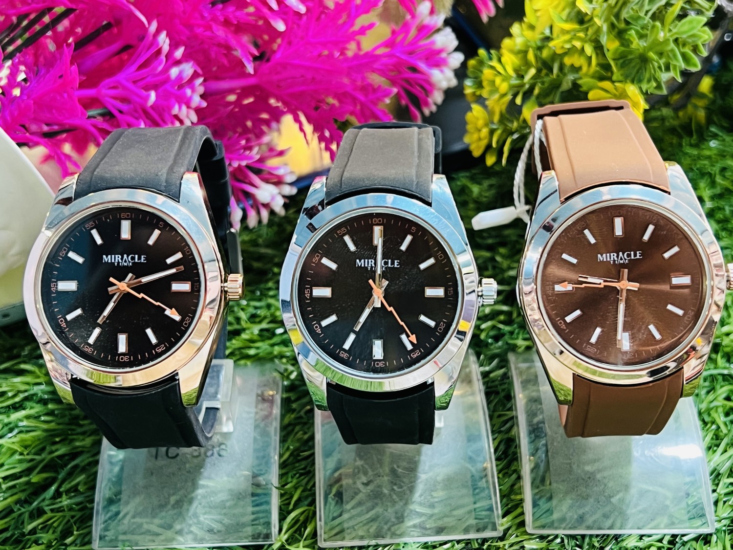 The watch has a sleek and modern design with a black dial and a polished silver-tone stainless steel case. The brand name “MIRACLE” is displayed on the dial. It features rectangular hour markers with luminous accents and a fine minute track along the outer rim. The hour and minute hands are gold-toned and broad, while the second hand is a slender gold-toned stick. The watch also has a black rubber strap, giving it a sporty yet sophisticated look. The bezel is smooth and reflective, complementing the overall aesthetic.